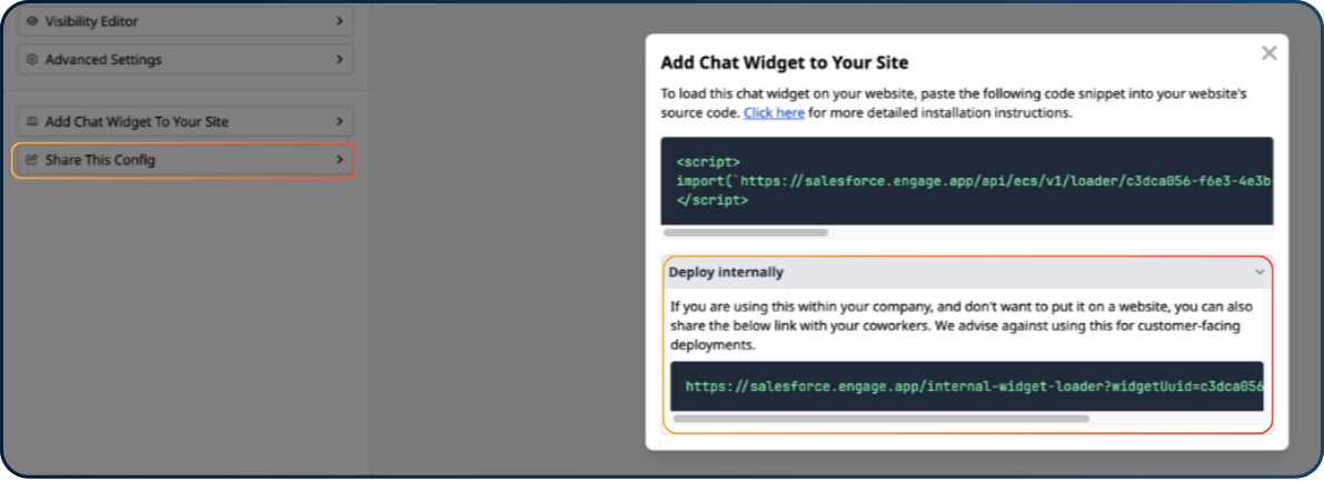 To set this up, click “Add widget to your site” in the config editor, then expand the “Deploying internally?” section.