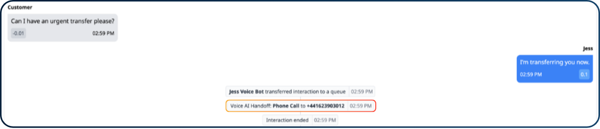 Voice AI transfers are now more clearly recorded in Interaction Logs. Transfers will show a structured record, making it easier to understand what happened during the interaction.